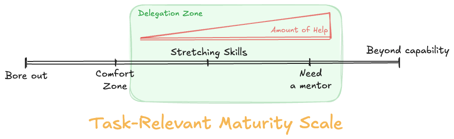The main goal is to stretch the person’s skills by helping them, not burn them out. If we consider the new work on someone’s task-relevant maturity scale, it should fall into the delegation zone.